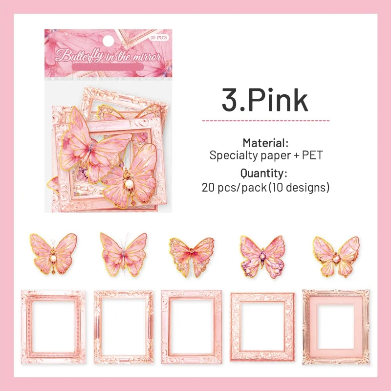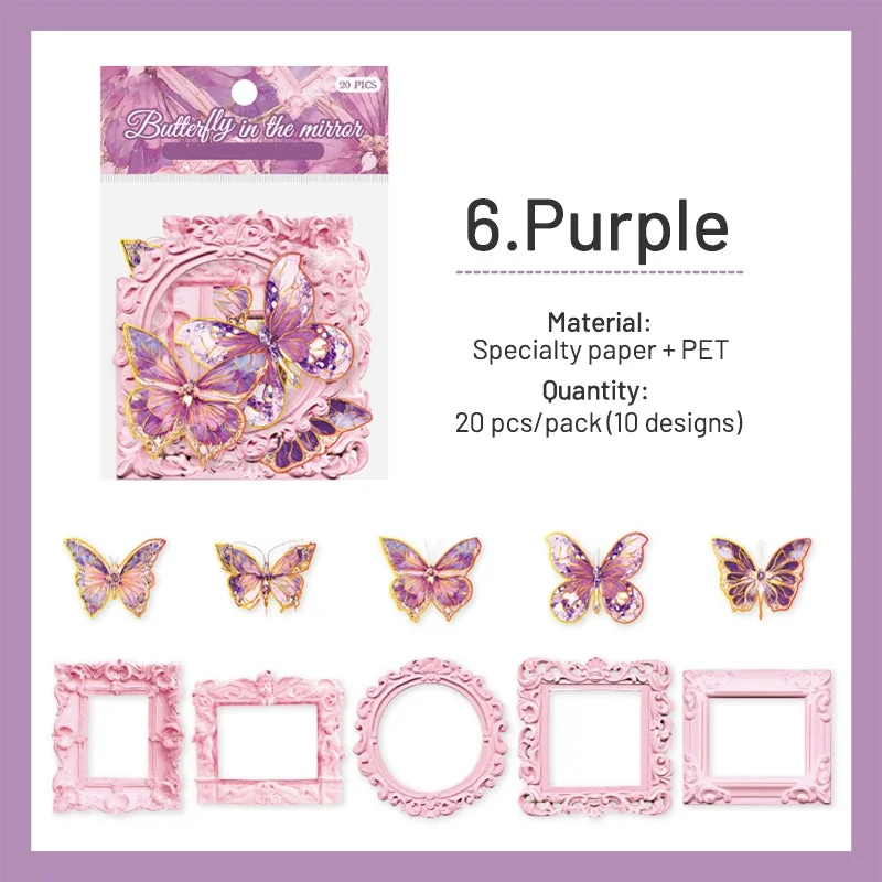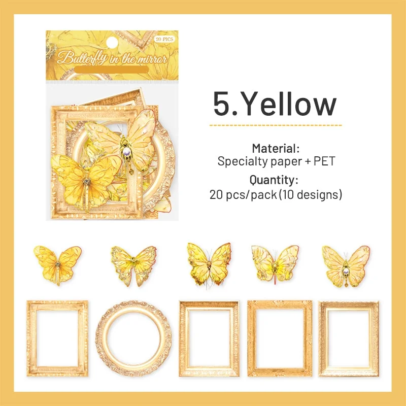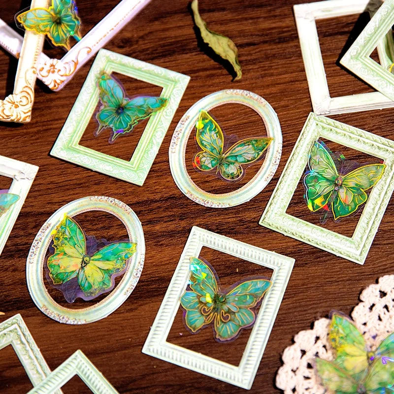 Introducing the captivating Dreamy Butterfly Holographic Decorative Paper collection, a stunning fusion of specialty paper and Polyethylene Terephthalate material. This exquisite assortment includes 20 sheets per pack, each adorned with 10 distinct designs featuring beautifully crafted butterfly motifs and intricate frames. With dimensions of 80 x 80 mm for the frames and 50 x 50 mm for the butterflies, these sheets showcase a blend of die-cutting, hot stamping, and matte printing techniques that create a holographic effect, resulting in a mesmerizing play of light.