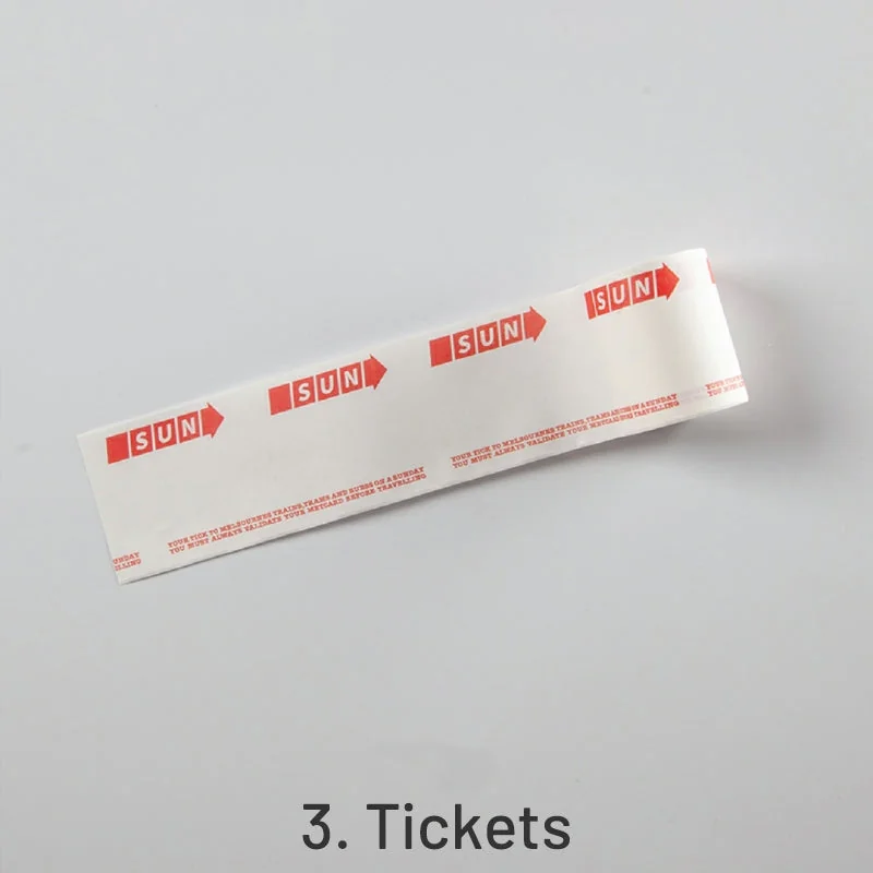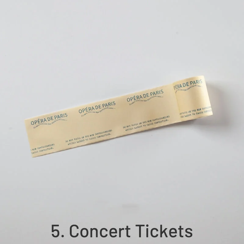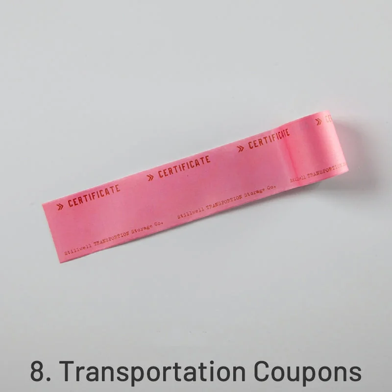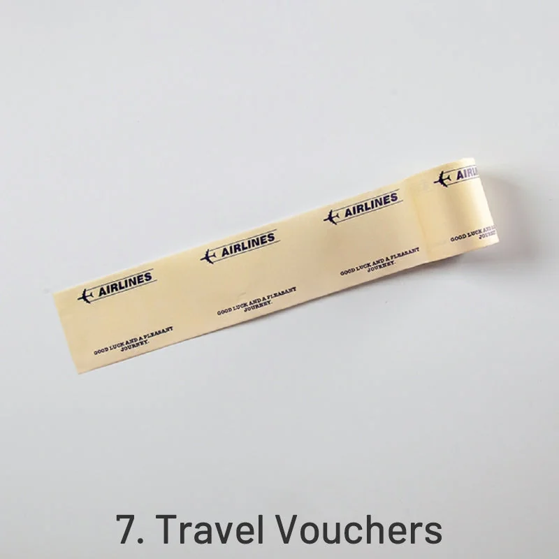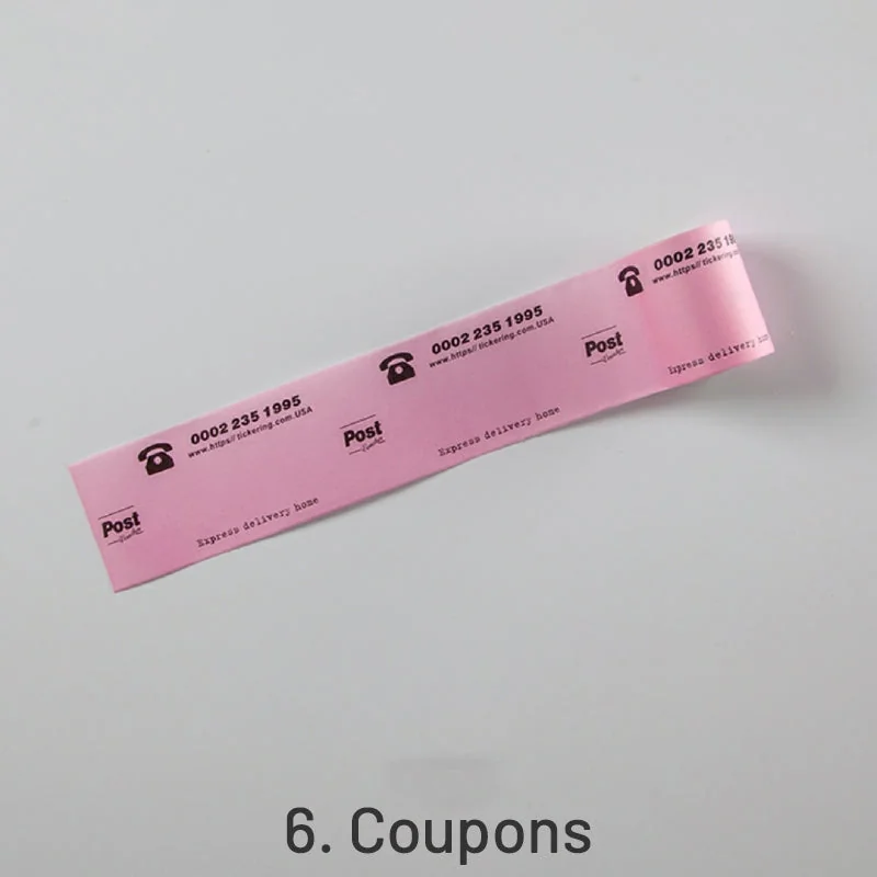 Choose from 8 unique styles: 1. Material Coupons, 2. Movie Tickets, 3. Event Tickets, 4. Air Coupons, 5. Concert Tickets, 6. Discount Coupons, 7. Travel Vouchers, and 8. Transportation Coupons. Each style includes various coupons and tickets, providing a personalized touch by allowing you to write your own information.