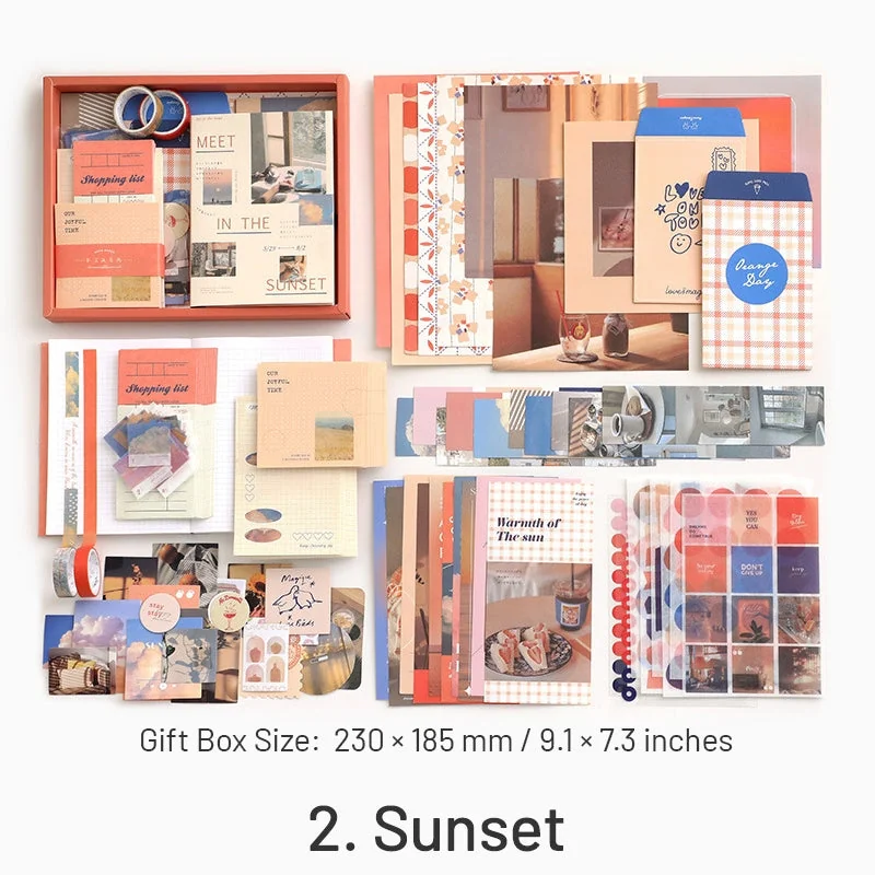 The Fresh Artistic Style Journal Gift Box Set seamlessly blends classic vintage elements into its theme, offering a unified and aesthetically pleasing backdrop for your journaling endeavors. With a comprehensive collection of 155 pieces, this set includes an array of diverse accessories and materials, leaving no detail overlooked. From Scrapbook Paper and Background Scrapbook Paper to Note Paper, Folded Note Paper, Number Stickers, Polyethylene Terephthalate + Washi Stickers, Cards, and Pocket inserts, every element is designed to elevate your journaling experience.