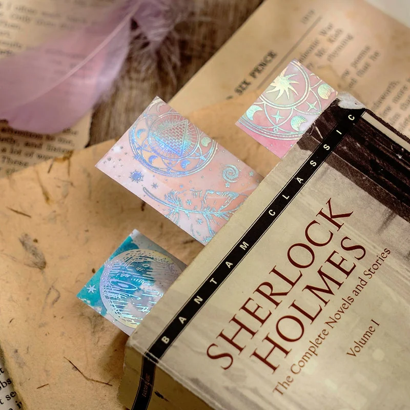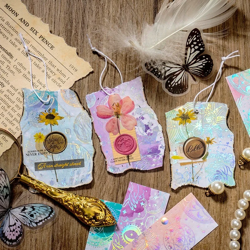 Each pack contains 20 mesmerizing pieces, featuring four distinct designs: Zodiac Signs, Feathers, Butterflies, and the vast Universe itself. When exposed to light, they dance with a symphony of colors, creating a dynamic and ever-changing visual experience. Their adhesive backing ensures effortless application, allowing you to decorate your journal, planner, or even phone case with ease.