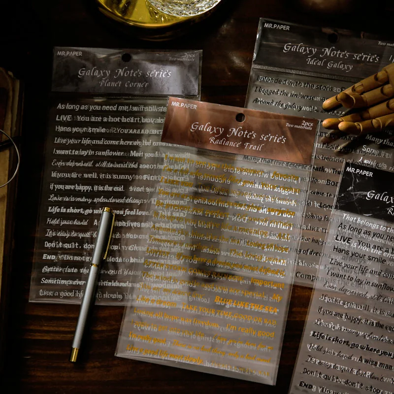 This Galaxy Notes simple retro English Vinyl sticker is made of upgraded, smooth, and waterproof Vinyl. The patterns are clear and translucent, and can be stuck repeatedly without any glue stains left. It has 4 styles, and each style contains 2 pieces of stickers. Each design combines two hot stamping processes, and the hot stamping processes of the four styles are not repeated, which respectively are: gold hot stamping + silver hot stamping, white hot stamping + black hot stamping, gold hot stamping + black hot stamping, white hot stamping + silver hot stamping. It’s perfect for decorating journals, scrapbooks, collages, greeting cards, invitations, envelopes, and gift wrappings, and it’s creative to use them on pens, cups, phone cases, laptop surfaces, etc.