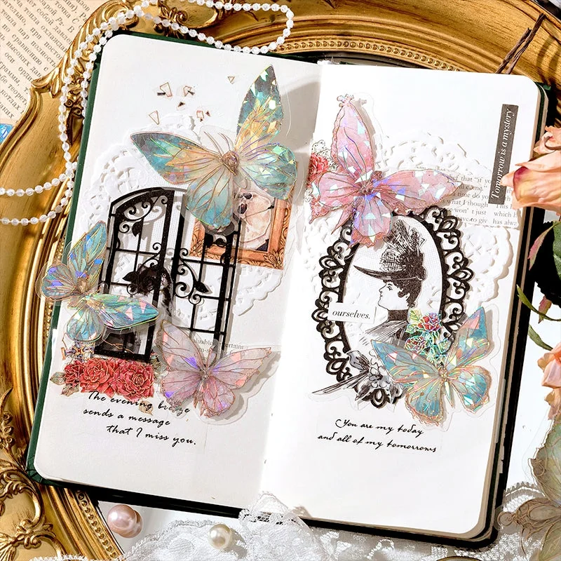 The adhesive is repositionable which is a game changer for journaling. I can move the Gem-Like Glittering Butterfly Clear Transparent Sticker stickers without tearing my pages.