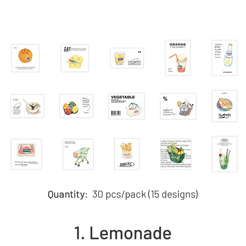 This cartoon convenience store food adhesive sticker is made of high-quality adhesive paper with clear printing and bright colors. It has 6 styles, covering cute food and beverage images like bread, chocolate, fruits, coffee, etc. Each style contains 30 stickers in 15 designs, enough to be used for a long time. With good stickiness, it can be used repeatedly. Just peel off the adhesive backing, you can stick it to any surface. It’s suitable for decorating journals, scrapbooks, greeting cards, invitations, envelopes, gift wrappings, phone cases, cups, skateboards, refrigerators, or other daily items.